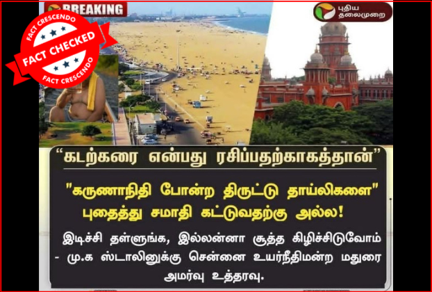 ‘‘கடற்கரை என்பது ரசிப்பதற்காகத்தான். கருணாநிதி போன்ற திருட்டு தாய்லிகளை புதைத்து சமாதி கட்டுவதற்கு அல்ல’’, என்று புதிய தலைமுறை செய்தி வெளியிட்டதாகக் கூறி, சமூக வலைதளங்களில் பகிரப்படும் ஒரு தகவல் பற்றி ஆய்வு மேற்கொண்டோம்.  தகவலின் விவரம்: இதனை வாசகர்கள் நமக்கு வாட்ஸ்ஆப் சாட்போட் (+919049053770) வழியே அனுப்பி, உண்மையா என்று சந்தேகம் கேட்டனர்.  இதில், ‘’ கடற்கரை என்பது ரசிப்பதற்காகத்தான். கருணாநிதி போன்ற திருட்டு தாய்லிகளை புதைத்து சமாதி கட்டுவதற்கு அல்ல! இடிச்சி தள்ளுங்க, இல்லன்னா […]
