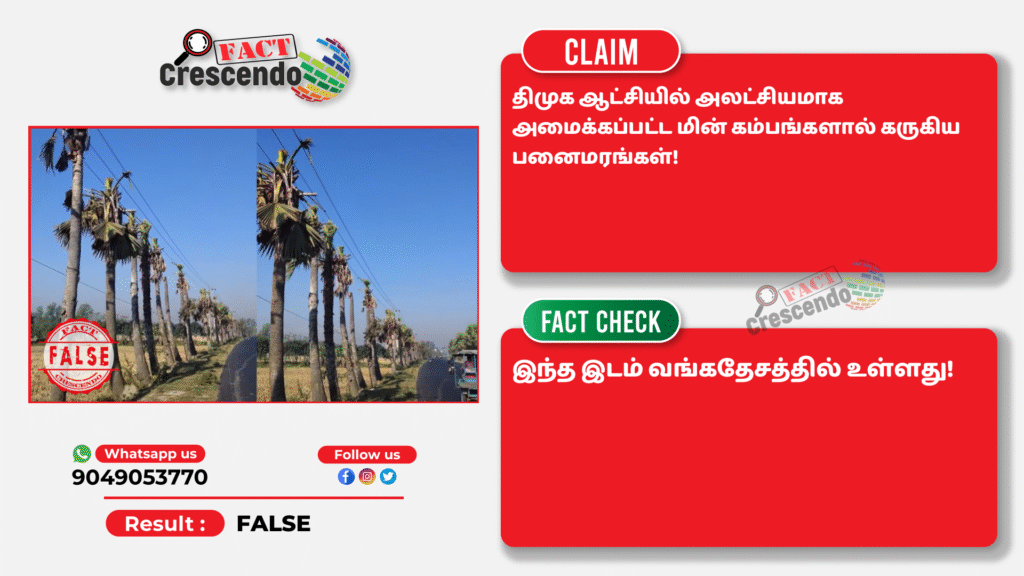 வங்கதேசத்தில் மின் கம்பங்கள் அமைக்கப்பட்டதால் பனை மரங்கள் கருகிய வீடியோவை தமிழ்நாட்டில் திமுக ஆட்சியில் என்று தவறாக சமூக ஊடகங்களில் பகிர்ந்திருப்பதை தகுந்த ஆதாரங்கள் அடிப்படையில் ஃபேக்ட் கிரஸண்டோ தமிழ் உறுதி செய்துள்ளது. எனவே, நமது வாசகர்கள், இத்தகைய தவறான செய்தி, புகைப்படங்கள், வீடியோ போன்றவற்றை உறுதி செய்யாமல் மற்றவர்களுக்குப் பகிர வேண்டாம் என கேட்டுக் கொள்கிறோம். வாசகர்கள் தங்களுக்கு சந்தேகம் என்று தோன்றும் தகவல், பதிவு, புகைப்படம், வீடியோவை எங்களது வாட்ஸ் ஆப் எண்ணிற்கு (+91 9049053770) அனுப்பினால், அதுபற்றி ஆய்வு செய்து உண்மை விவரத்தை வெளியிடுகிறோம்.