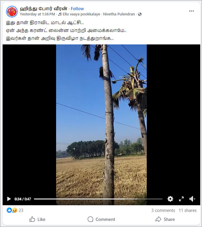 மின் கம்பிகள் உராசியதால் பனை மரங்கள் பட்டுபோய் இருக்கும் வீடியோ ஃபேஸ்புக்கில் பதிவிடப்பட்டுள்ளது. நிலைத் தகவலில், “இது தான் திராவிட மாடல் ஆட்சி… ஏன் அந்த கரண்ட் லைன்ன மாற்றி அமைக்கலாமே.. இவர்கள் தான் அறிவு திருவிழா நடத்துறாங்க…” என்று குறிப்பிடப்பட்டிருந்தது. இந்த வீடியோவை பலரும் சமூக ஊடகங்களில் பதிவிட்டு வருகின்றனர்.
