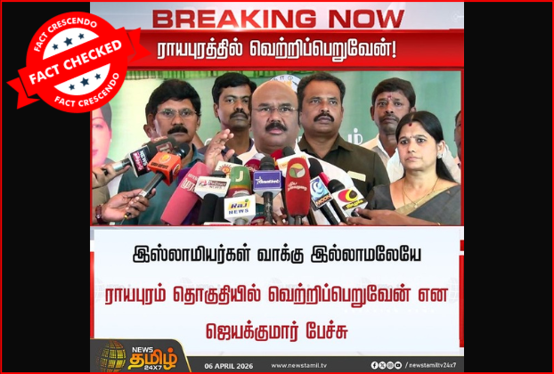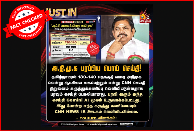 தமிழகத்தில் அதிமுக 130 முதல் 140 தொகுதிகளை வெல்லும் என்று சிஎன்என் ஊடகம் கூறியதாக போலியான செய்தியை அ.தி.மு.க பரப்பியதாக ஒரு பதிவு சமூக ஊடகங்களில் வைரலாக பகிரப்பட்டு வருகிறது. இது தொடர்பாக ஆய்வு செய்தோம். தகவலின் விவரம்: உண்மைப் பதிவைக் காண: Facebook I Archive “அ.தி.மு.க பரப்பிய பொய் செய்தி!” என்று குறிப்பிட்டு கலைஞர் செய்திகள் நியூஸ் கார்டு வெளியிட்டுள்ளது. மேலும் அதில், “தமிழ்நாட்டில் 130-140 தொகுதி வரை அதிமுக வென்று ஆட்சியைக் கைப்பற்றும் […]