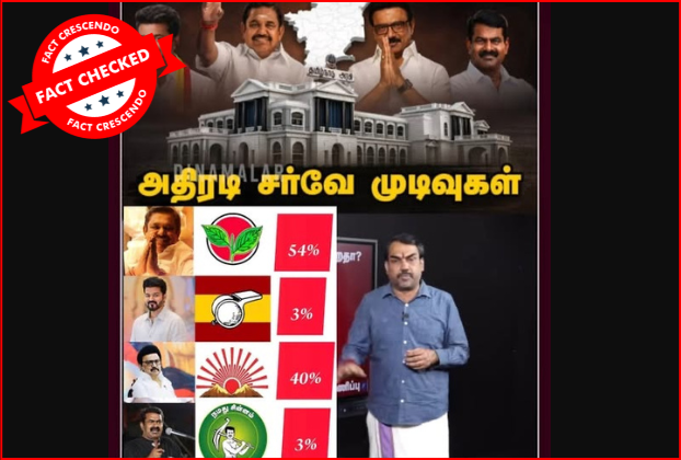 ‘‘அதிமுக கூட்டணி 54%, திமுக 40%, தவெக மற்றும் நாதக தலா 3% வாக்குகள் பெறும்,’’ என்று சாணக்யா, தினமலர் கருத்துக் கணிப்பு வெளியிட்டதாகக் கூறி, சமூக வலைதளங்களில் பரவும் தகவல் பற்றி ஆய்வு மேற்கொண்டோம்.  தகவலின் விவரம்: இதனை வாசகர்கள் நமக்கு வாட்ஸ்ஆப் சாட்போட் (+919049053770) வழியே அனுப்பி, உண்மையா என்று சந்தேகம் கேட்டனர். இதில், ‘’அதிரடி சர்வே முடிவுகள்.  அதிமுக கூட்டணி 54%, திமுக 40%, தவெக மற்றும் நாதக தலா 3% வாக்குகள் […]