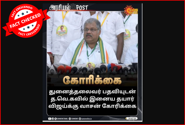 த.வெ.க-வில் இணையத் தயார் என்றும் துணைத் தலைவர் பதவி தர வேண்டும் என்றும் விஜய்யிடம் தமிழ் மாநில காங்கிரஸ் தலைவர் ஜி.கே.வாசன் கோரிக்கை வைத்ததாக ஒரு நியூஸ் கார்டு சமூக ஊடகங்களில் பகிரப்பட்டு வருகிறது. இது தொடர்பாக ஆய்வு செய்தோம். தகவலின் விவரம்: உண்மைப் பதிவைக் காண: Facebook I Archive சன் நியூஸ் வெளியிட்டது போன்று நியூஸ் கார்டு ஃபேஸ்புக்கில் பதிவிடப்பட்டுள்ளது. அதில், “கோரிக்கை. துனைத்தலைவர் பதவியுடன் த.வெ.கவில் இனைய தயார் விஜய்க்கு வாசன் கோரிக்கை” […]