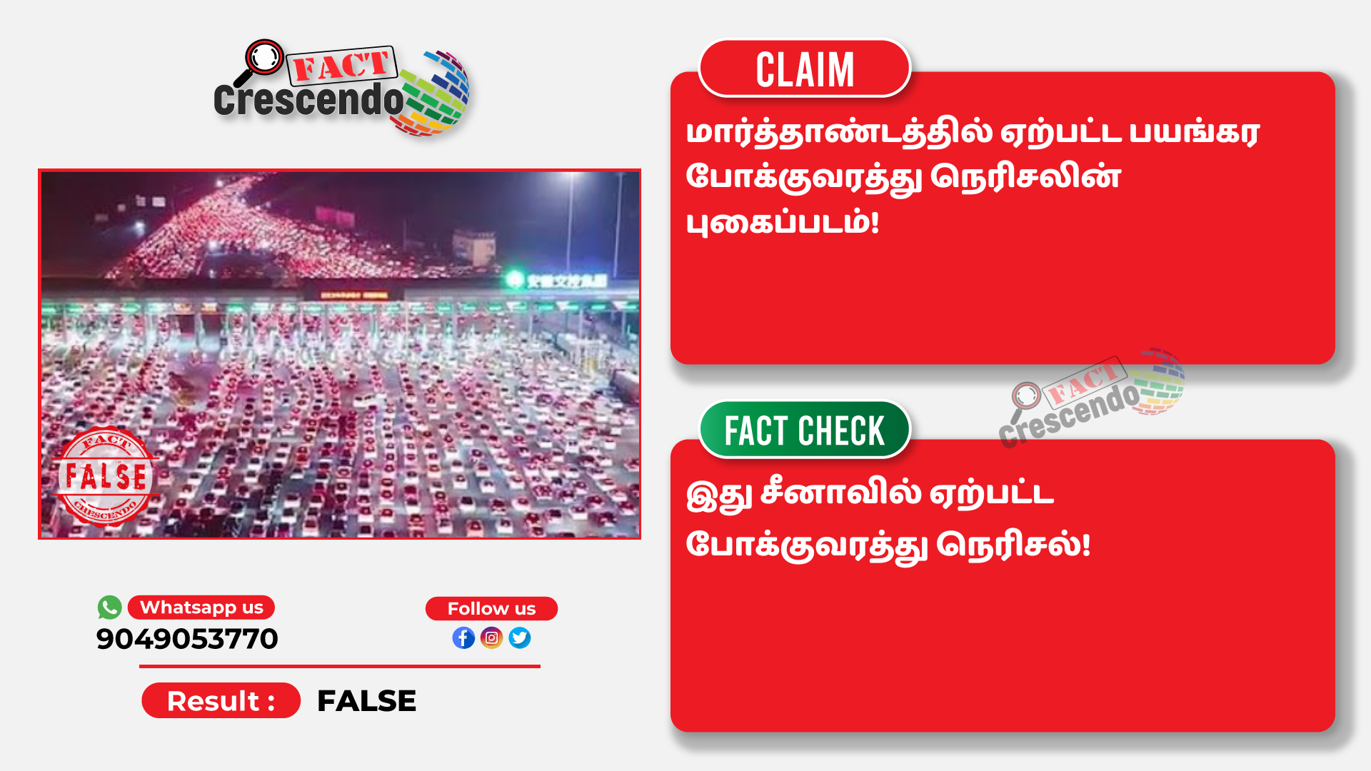 சீனாவில் ஏற்பட்ட போக்குவரத்து நெரிசலை தமிழ்நாட்டின் மார்த்தாண்டத்தில் ஏற்பட்ட டிராஃபிக் ஜாம் என்று தவறாக பகிர்ந்திருப்பதை தகுந்த ஆதாரங்கள் அடிப்படையில் ஃபேக்ட் கிரஸண்டோ தமிழ் உறுதி செய்துள்ளது. எனவே, நமது வாசகர்கள், இத்தகைய தவறான செய்தி, புகைப்படங்கள், வீடியோ போன்றவற்றை உறுதி செய்யாமல் மற்றவர்களுக்குப் பகிர வேண்டாம் என கேட்டுக் கொள்கிறோம். வாசகர்கள் தங்களுக்கு சந்தேகம் என்று தோன்றும் தகவல், பதிவு, புகைப்படம், வீடியோவை எங்களது வாட்ஸ் ஆப் எண்ணிற்கு (+91 9049053770) அனுப்பினால், அதுபற்றி ஆய்வு செய்து உண்மை விவரத்தை வெளியிடுகிறோம்.