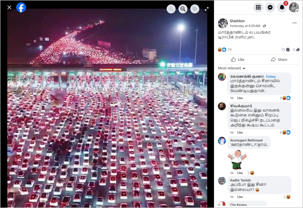 சீனாவில் எட்டு நாள் தேசிய விடுமுறையைத் தொடர்ந்து அன்ஹுயி மாகாணத்தின் (Anhui province) மிகப்பெரிய சுங்கச்சாவடியான வுசுவாங்கில் உள்ள 36 பாதைகளில் கூட்ட நெரிசல் ஏற்பட்டதாக வீடியோவுடன் செய்தி வெளியாகி இருந்தது. இந்த நிலையில் அந்த வீடியோவின் காட்சியை எடுத்து மார்த்தாண்டம், மதுரை என்று தமிழ்நாட்டின் சில பகுதிகளைக் குறிப்பிட்டு அங்கு போக்குவரத்து நெரிசல் ஏற்பட்டதாக பலரும் பதிவிட்டு வருகின்றனர்.