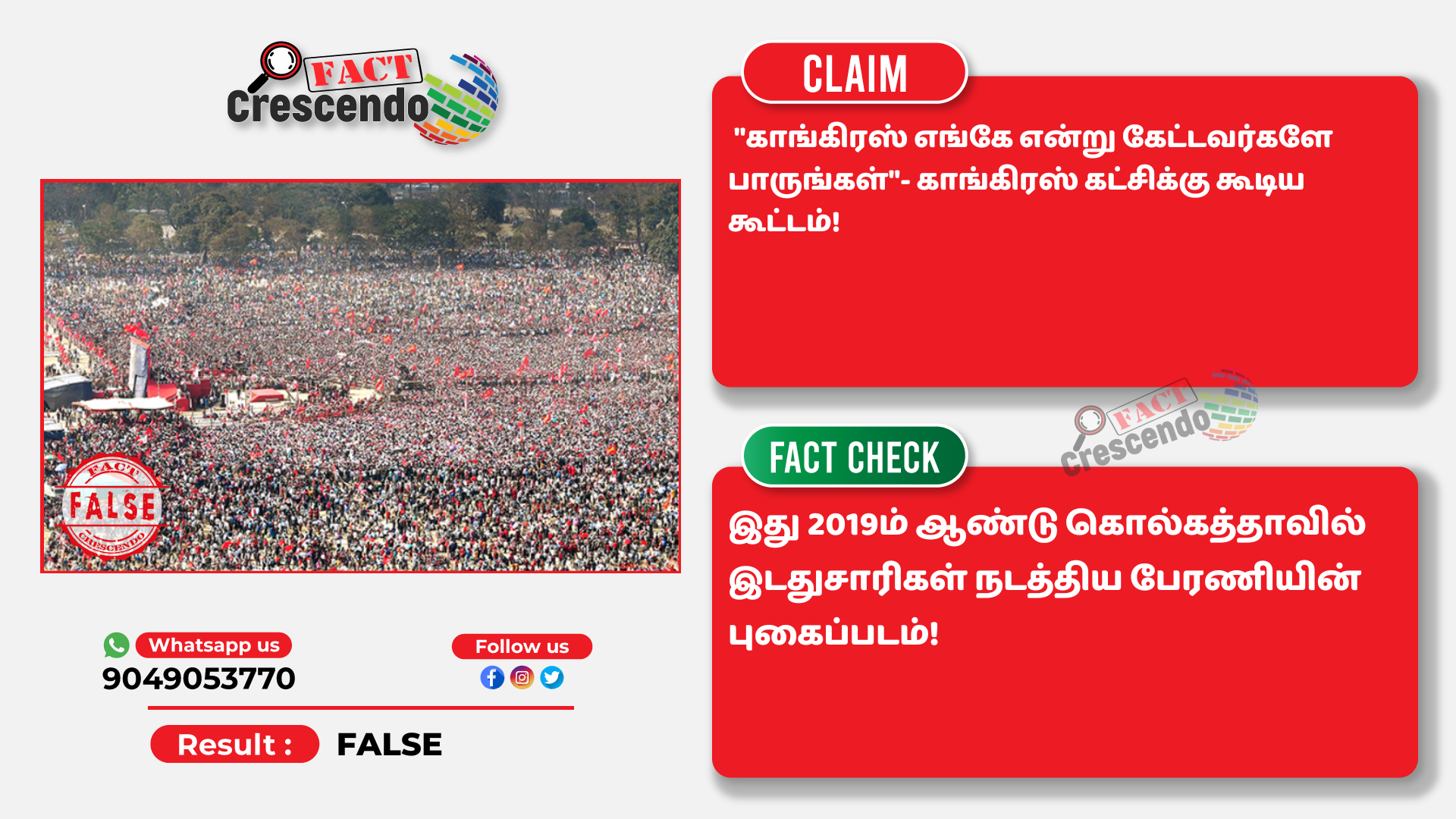 2019ம் ஆண்டு கொல்கத்தாவில் இடதுசாரிகள் நடத்திய பேரணியின் புகைப்படத்தை காங்கிரஸ் கட்சிக்கு கூடிய மக்கள் என்று தவறாக பகிர்ந்திருப்பதை தகுந்த ஆதாரங்கள் அடிப்படையில் ஃபேக்ட் கிரஸண்டோ தமிழ் உறுதி செய்துள்ளது. எனவே, நமது வாசகர்கள், இத்தகைய தவறான செய்தி, புகைப்படங்கள், வீடியோ போன்றவற்றை உறுதி செய்யாமல் மற்றவர்களுக்குப் பகிர வேண்டாம் என கேட்டுக் கொள்கிறோம். வாசகர்கள் தங்களுக்கு சந்தேகம் என்று தோன்றும் தகவல், பதிவு, புகைப்படம், வீடியோவை எங்களது வாட்ஸ் ஆப் எண்ணிற்கு (+91 9049053770) அனுப்பினால், அதுபற்றி ஆய்வு செய்து உண்மை விவரத்தை வெளியிடுகிறோம்.