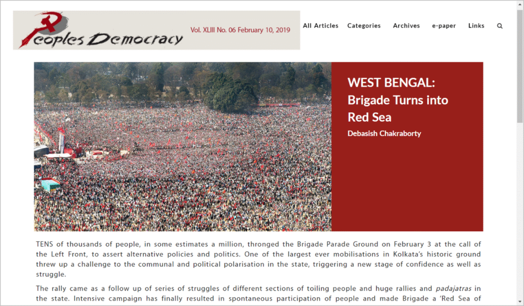 2019ம் ஆண்டு பிப்ரவரி 6ம் தேதி வெளியாகி இருந்த பதிவு ஒன்றில் மேற்கு வங்கம் கொல்கத்தாவின் பிரிட்ஜ் மைதானத்தில் இடதுசாரி கூட்டணி சார்பில் ஏற்பாடு செய்யப்பட்டிருந்த பேரணியில் லட்சக்கணக்கானோர் கலந்து கொண்டனர் என்று குறிப்பிடப்பட்டிருந்தது. இதன் அடிப்படையில் தேடிய போது, பிப்ரவரி 3, 2019ம் ஆண்டு கொல்கத்தாவில் இடதுசாரிகள் சார்பில் பேரணி நடந்ததாகப் பல செய்திகள் நமக்குக் கிடைத்தன. பிரபல புகைப்படங்கள் விற்பனை தளமான alamy.com-ல் கூட இந்த புகைப்படம் வெளியாகி இருந்ததைக் காண முடிந்தது. அதிலும் இடதுசாரிகள் நடத்திய பேரணி என்றே குறிப்பிட்டிருந்தனர்.