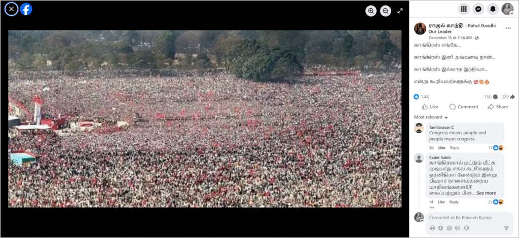 டெல்லியில் 2025 டிசம்பர் 14ம் தேதி வாக்குத் திருட்டுக்கு எதிராக ராம் லீலா மைதானத்தில் காங்கிரஸ் கட்சி சார்பில் போராட்டம் நடத்தப்பட்டது. இந்த நிலையில், டிசம்பர் 15ம் தேதி காங்கிரஸ் கட்சி எங்கே என்று கேட்டவர்களுக்கான பதில் என்று மைதானம் முழுக்க மக்கள் கூடியிருந்த புகைப்படம் ஒன்றை சிலர் சமூக ஊடகங்களில் பதிவிட்டுள்ளனர்.