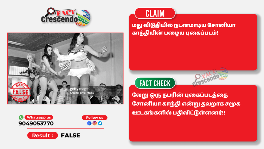 மதுவிடுதியில் நடனமாடிய சோனியா காந்தி என்று பரவும் புகைப்படம் தவறானது என்பதை தகுந்த ஆதாரங்கள் அடிப்படையில் ஃபேக்ட் கிரஸண்டோ தமிழ் உறுதி செய்துள்ளது. எனவே, இத்தகைய தவறான செய்தி, புகைப்படங்கள், வீடியோ போன்றவற்றை உறுதி செய்யாமல் மற்றவர்களுக்குப் பகிர வேண்டாம் என கேட்டுக் கொள்கிறோம். வாசகர்கள் தங்களுக்கு சந்தேகம் என்று தோன்றும் தகவல், பதிவு, புகைப்படம், வீடியோவை எங்களது வாட்ஸ் ஆப் எண்ணிற்கு (+91 9049053770) அனுப்பினால், அதுபற்றி ஆய்வு செய்து உண்மை விவரத்தை வெளியிடுகிறோம்.