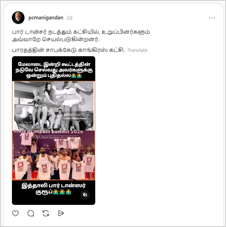 நிலைத் தகவலில், “பார் டான்சர் நடத்தும் கட்சியில், உறுப்பினர்களும் அவ்வாறே செயல்படுகின்றனர். பாரதத்தின் சாபக்கேடு காங்கிரஸ் கட்சி” என்று குறிப்பிடப்பட்டிருந்தது. இந்த பதிவை பலரும் சமூக ஊடகங்களில் பதிவிட்டு வருகின்றனர்.