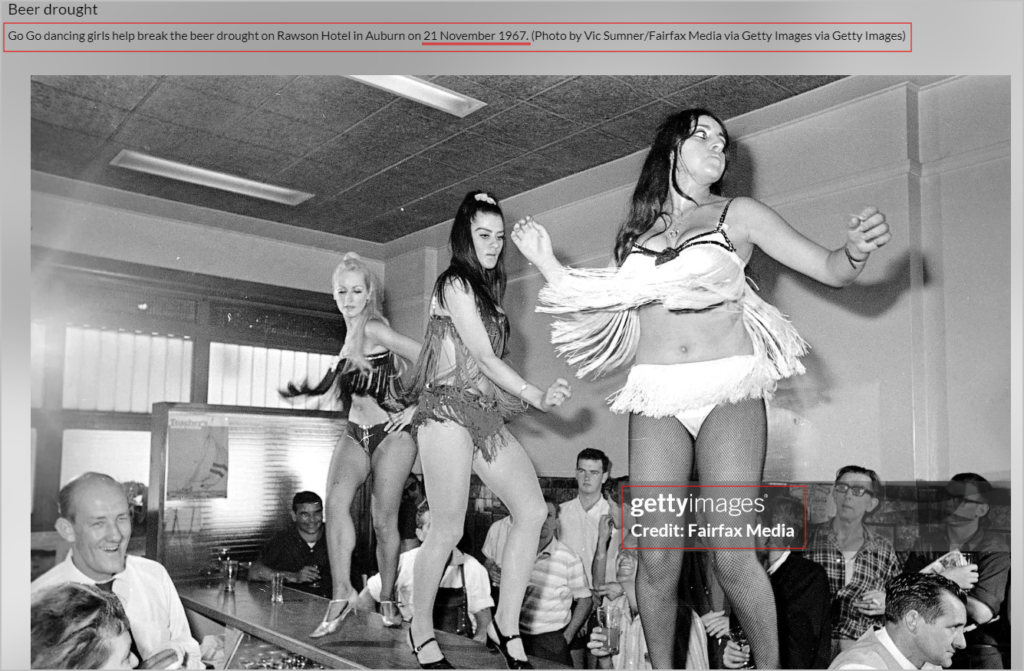 புகைப்படத்தில் உள்ள பெண்மணியைப் பார்க்க சோனியா காந்தி போல இல்லை. இது தெரிந்தும் வதந்தியைப் பரப்பியுள்ளனர். இதை ஆதாரங்கள் அடிப்படையில் உறுதி செய்ய ஆய்வைத் தொடங்கினோம். இந்த புகைப்படத்திலேயே gettyimages லோகோ உள்ளது. அந்த இணையதளத்திற்குச் சென்று புகைப்படத்தை தேடி எடுத்தோம். அதில், இந்த புகைப்படம் 1967ம் ஆண்டு நவம்பர் மாதம் 12ம் தேதி அமெரிக்காவின் Auburn என்ற இடத்தில் உள்ள ஒரு ஹோட்டலில் எடுக்கப்பட்டது என்று குறிப்பிடப்பட்டிருந்தது. அதாவது, சோனியா – ராஜிவ் காந்தி திருமணம் (பிப்ரவரி 1968) நடப்பதற்கு நான்கு மாதங்களுக்கு முன்பு எடுக்கப்பட்டதாக குறிப்பிடப்பட்டிருந்தது.