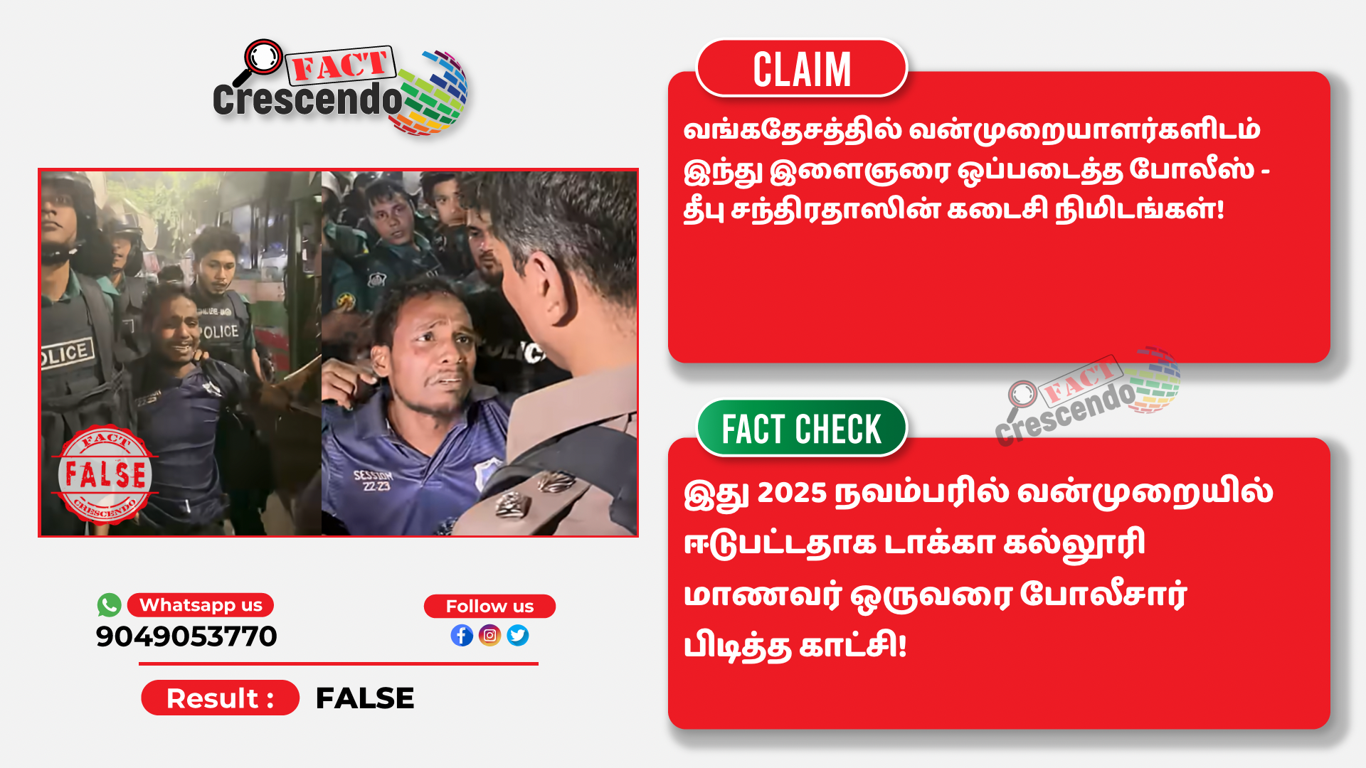 வங்கதேசத்தில் கல்லூரி மாணவர் ஒருவரை 2025 நவம்பரில் வன்முறையில் ஈடுபட்டதற்காக போலீசார் பிடித்த வீடியோவை 2025 டிசம்பரில் இந்து இளைஞர் கொல்லப்பட்ட சம்பவத்துடன் தொடர்புபடுத்தி தவறாக சமூக ஊடகங்களில் பகிர்ந்திருப்பதை தகுந்த ஆதாரங்கள் அடிப்படையில் ஃபேக்ட் கிரஸண்டோ தமிழ் உறுதி செய்துள்ளது. எனவே, நமது வாசகர்கள், இத்தகைய தவறான செய்தி, புகைப்படங்கள், வீடியோ போன்றவற்றை உறுதி செய்யாமல் மற்றவர்களுக்குப் பகிர வேண்டாம் என கேட்டுக் கொள்கிறோம். வாசகர்கள் தங்களுக்கு சந்தேகம் என்று தோன்றும் தகவல், பதிவு, புகைப்படம், வீடியோவை எங்களது வாட்ஸ் ஆப் எண்ணிற்கு (+91 9049053770) அனுப்பினால், அதுபற்றி ஆய்வு செய்து உண்மை விவரத்தை வெளியிடுகிறோம்.