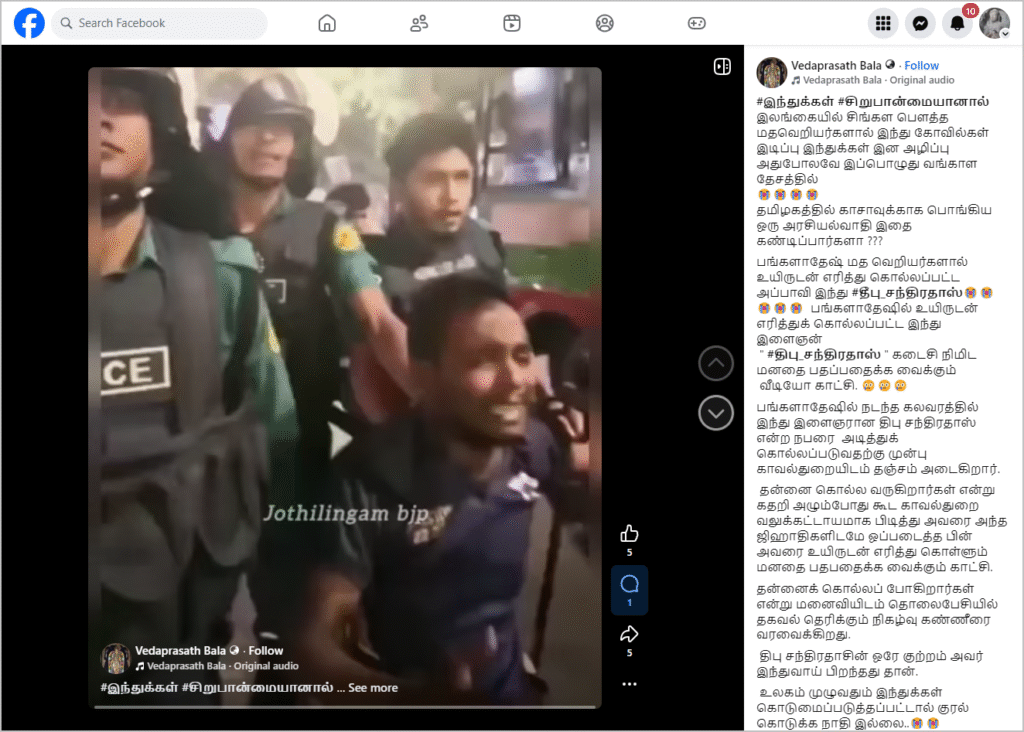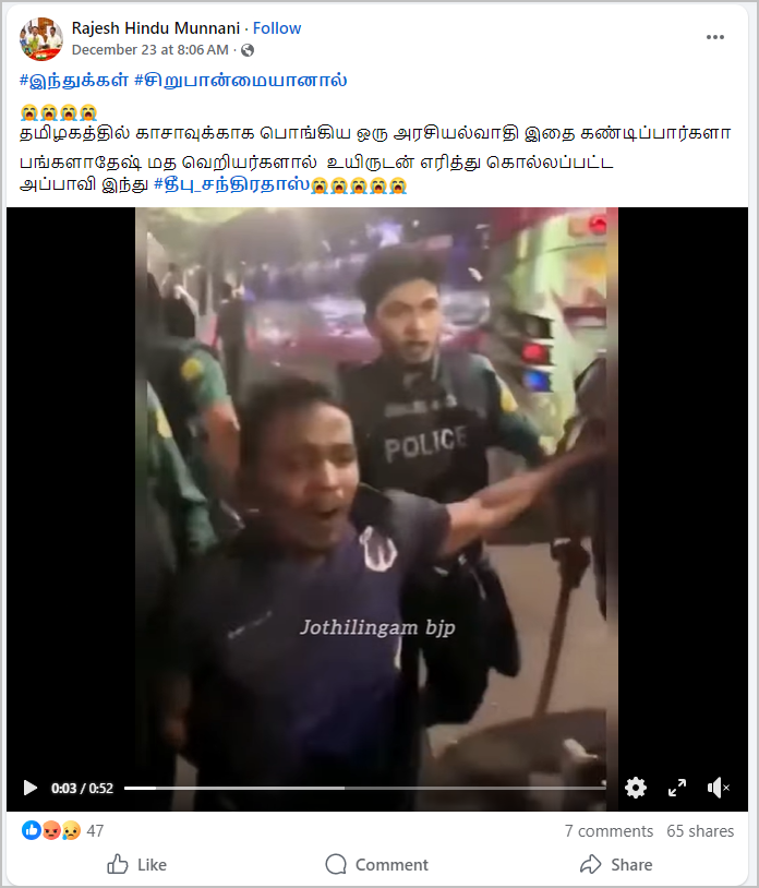 😭😭😭😭 தமிழகத்தில் காசாவுக்காக பொங்கிய ஒரு அரசியல்வாதி இதை கண்டிப்பார்களா பங்களாதேஷ் மத வெறியர்களால் உயிருடன் எரித்து கொல்லப்பட்ட அப்பாவி இந்து #தீபு_சந்திரதாஸ்😭😭😭😭😭” என்று குறிப்பிடப்பட்டிருந்தது. இதே போன்று மற்றொரு பதிவில், “இளைஞன் ” #திபு_சந்திரதாஸ் ” கடைசி நிமிட மனதை பதப்பதைக்க வைக்கும் வீடியோ காட்சி. 😢😢😢