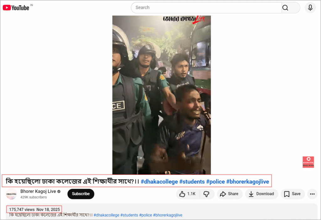 நாம் ஆய்வுக்கு எடுத்துக்கொண்ட வீடியோ நவம்பர் 18ம் தேதி சமூக ஊடகங்களில் வெளியாகி இருப்பதை உறுதி செய்துள்ளோம். மேலும் அந்த நபர் டாக்கா கல்லூரி மாணவர் என்று அப்போதே வங்கதேச ஊடகங்களில் செய்தி வெளியாகி இருப்பதையும் கண்டறிந்துள்ளோம். வன்முறையில் ஈடுபட்டதாக அவரை போலீசார் பிடித்திருப்பது அவரது அழுகை உரையாடல் மூலம் உறுதி செய்துள்ளோம்.