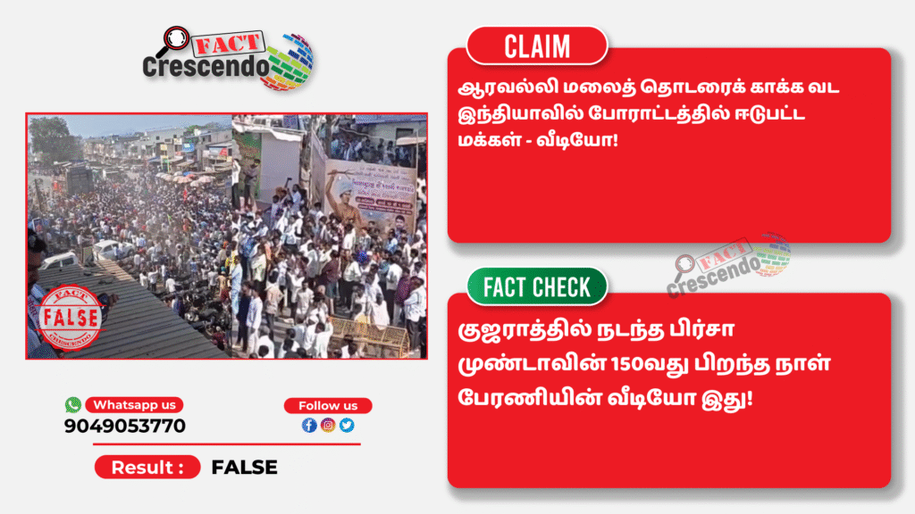 பிர்சா முண்டாவின் 150வது பிறந்த நாள் விழாவையொட்டி குஜராத் ஆம் ஆத்மி எம்.எல்.ஏ ஏற்பாடு செய்திருந்த பேரணி வீடியோவை ஆரவல்லி மலைத் தொடரை காக்க போராடும் மக்கள் என்று தவறாக சமூக ஊடகங்களில் பகிர்ந்திருப்பதை தகுந்த ஆதாரங்கள் அடிப்படையில் ஃபேக்ட் கிரஸண்டோ தமிழ் உறுதி செய்துள்ளது. எனவே, நமது வாசகர்கள், இத்தகைய தவறான செய்தி, புகைப்படங்கள், வீடியோ போன்றவற்றை உறுதி செய்யாமல் மற்றவர்களுக்குப் பகிர வேண்டாம் என கேட்டுக் கொள்கிறோம். வாசகர்கள் தங்களுக்கு சந்தேகம் என்று தோன்றும் தகவல், பதிவு, புகைப்படம், வீடியோவை எங்களது வாட்ஸ் ஆப் எண்ணிற்கு (+91 9049053770) அனுப்பினால், அதுபற்றி ஆய்வு செய்து உண்மை விவரத்தை வெளியிடுகிறோம்.