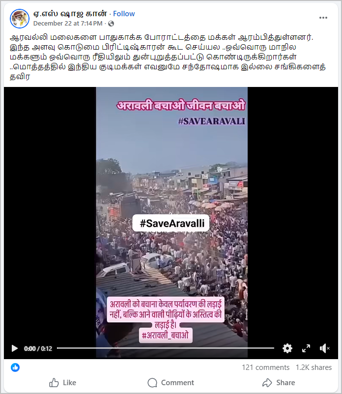 ஆயிரக்கணக்கான மக்கள் பேரணியாக செல்லும் நிகழ்வின் வீடியோ ஃபேஸ்புக்கில் பகிரப்பட்டுள்ளது. வீடியோவில் ஆங்கிலத்தில் SAVE SRAVALLI என்று எழுதப்பட்டிருந்தது. நிலைத் தகவலில், “ஆரவல்லி மலைகளை பாதுகாக்க போராட்டத்தை மக்கள் ஆரம்பித்துள்ளனர். இந்த அளவு கொடுமை பிரிட்டிஷ்காரன் கூட செய்யல ..ஒவ்வொரு மாநில மக்களும் ஒவ்வொரு ரீதியிலும் துன்புறுத்தப்பட்டு கொண்டிருக்கிறார்கள் .. மொத்தத்தில் இந்திய குடிமக்கள் எவனுமே சந்தோஷமாக இல்லை சங்கிகளைத் தவிர” என்று குறிப்பிடப்பட்டிருந்தது. இந்த வீடியோவை பலரும் சமூக ஊடகங்களில் பதிவிட்டு வருகின்றனர்.