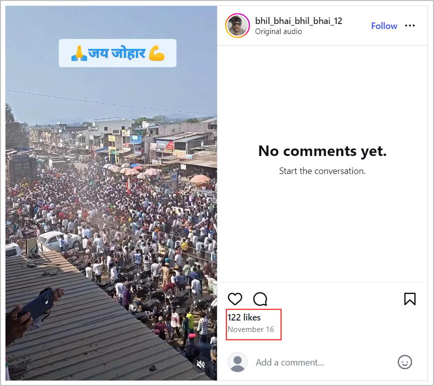நாம் ஆய்வுக்கு எடுத்துக்கொண்ட இந்த வீடியோவில் Super Zankar என்று ஒரு வாகனத்தில் எழுதியிருப்பதைக் காண முடிகிறது. இதன் அடிப்படையில் தேடிய போது, நவம்பர் 15, 2025 அன்று குஜராத் மாநிலம் நேத்ராங் என்ற ஊரில் பிர்சா முண்டாவின் ஜெயந்தி விழா கொண்டாடப்பட்ட போது Super Zankar இசைக் குழுவின் இசை நிகழ்ச்சி நடத்தப்பட்டதாகப் பல வீடியோக்கள் நமக்குக் கிடைத்தன.