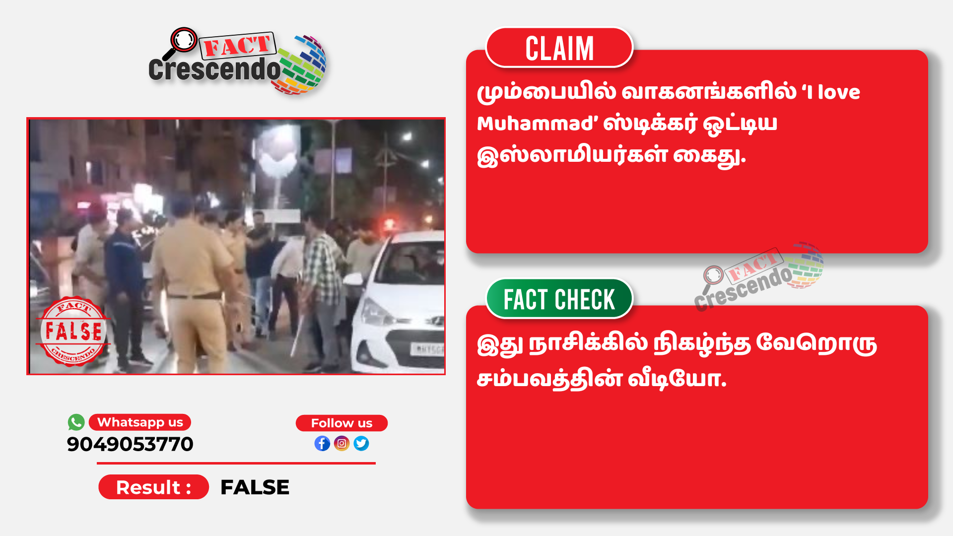 ‘’மும்பையில் வாகனங்களில் ‘I love Muhammad’ ஸ்டிக்கர் ஒட்டிய இஸ்லாமியர்களை போலீசார் கைது செய்தனர்,’’ என்று கூறி, சமூக வலைதளங்களில் பகிரப்படும் ஒரு தகவல் பற்றி ஆய்வு மேற்கொண்டோம்.