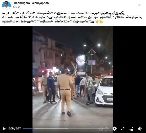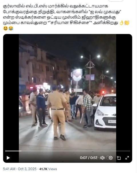 இதில், ‘’ குர்லாவில் எல்.பி.எஸ் மார்க்கில் வலுக்கட்டாயமாக போக்குவரத்தை நிறுத்தி, வாகனங்களில் “ஐ லவ் முகமது” என்ற ஸ்டிக்கர்களை ஒட்டிய முஸ்லிம் ஜிஹாதிகளுக்கு மும்பை காவல்துறை *”சரியான சிகிச்சை”* அளிக்கிறது 👌👏😃😂,’’ என்று எழுதப்பட்டுள்ளது.
