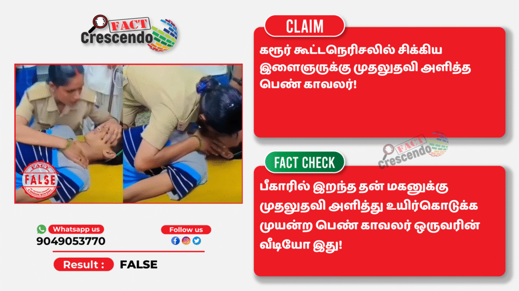 பீகாரில் இறந்த தன் மகனுக்கு முதலுதவி அளித்து உயிர்கொடுக்க பெண் காவலர் ஒருவர் முயற்சி மேற்கொண்டபோது எடுக்கப்பட்ட வீடியோவை கரூரில் தவெக கூட்டத்தின் போது எடுக்கப்பட்டது என்று தவறாக சமூக ஊடகங்களில் பகிர்ந்திருப்பதை தகுந்த ஆதாரங்கள் அடிப்படையில் ஃபேக்ட் கிரஸண்டோ தமிழ் உறுதி செய்துள்ளது. எனவே, நமது வாசகர்கள், இத்தகைய தவறான செய்தி, புகைப்படங்கள், வீடியோ போன்றவற்றை உறுதி செய்யாமல் மற்றவர்களுக்குப் பகிர வேண்டாம் என கேட்டுக் கொள்கிறோம். வாசகர்கள் தங்களுக்கு சந்தேகம் என்று தோன்றும் தகவல், பதிவு, புகைப்படம், வீடியோவை எங்களது வாட்ஸ் ஆப் எண்ணிற்கு (+91 9049053770) அனுப்பினால், அதுபற்றி ஆய்வு செய்து உண்மை விவரத்தை வெளியிடுகிறோம்.