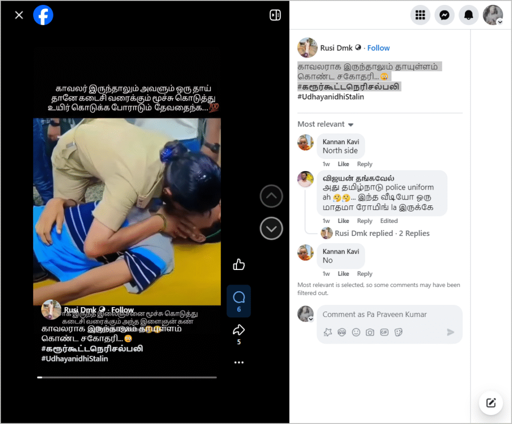 பெண் காவலர் ஒருவர் இளைஞர் ஒருவருக்கு வாயில் காற்றை ஊதி முதலுதவி அளித்த வீடியோ ஃபேஸ்புக்கில் பதிவிடப்பட்டுள்ளது. வீடியயோவில் “காவலர் இருந்தாலும் அவளும் ஒரு தாய் தானே கடைசி வரைக்கும் மூச்சு கொடுத்து உயிர் கொடுக்க போராடும் தேவதைந்க சாக இருந்த இளைஞனை மூச்சு ககொடுத்து கடைசி வரைக்கும் அந்த இளைஞன் கண் திறக்கவில்லை” என்று இருந்தது. நிலைத் தகவலில். “காவலராக இருந்தாலும் தாயுள்ளம் கொண்ட சகோதரி…🥲 #கரூர்கூட்டநெரிசல்பலி ” என்று குறிப்பிடப்பட்டிருந்தது. இந்த வீடியோவை பலரும் சமூக ஊடகங்களில் பதிவிட்டு வருகின்றனர்.