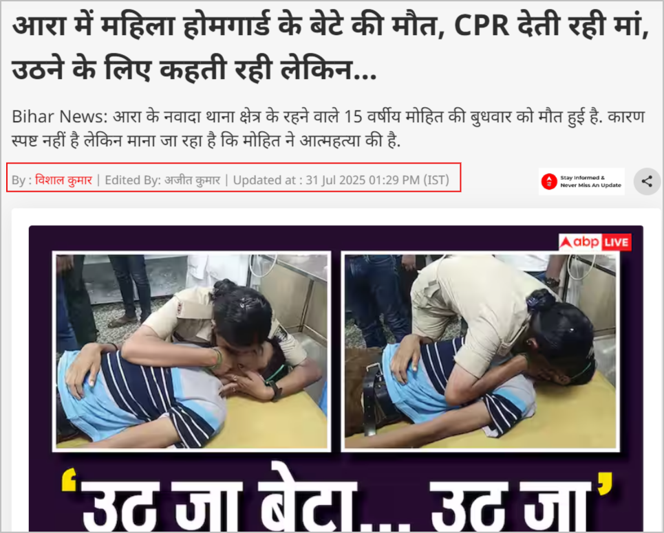அதில், பீகாரில் ஆரா மாவட்ட ஆட்சியர் அலுவலகத்தில் காலராக பணியாற்றி வந்த பெண்மணியின் 15 வயது மகன் தற்கொலை செய்துகொண்டதாகக் கூறப்படுகிறது. மகன் உயிரிழந்ததை ஏற்க மறுத்த தாய், இறந்த சிறுவனின் உடலுக்கு முதலுதவி செய்து, எப்படியாவது உயிர் பிழைக்க வைத்துவிட முடியாதா என்று முயற்சி செய்த செயல் பார்த்தவர்களைக் கண் கலங்கச் செய்தது” என்று குறிப்பிடப்பட்டிருந்தது.