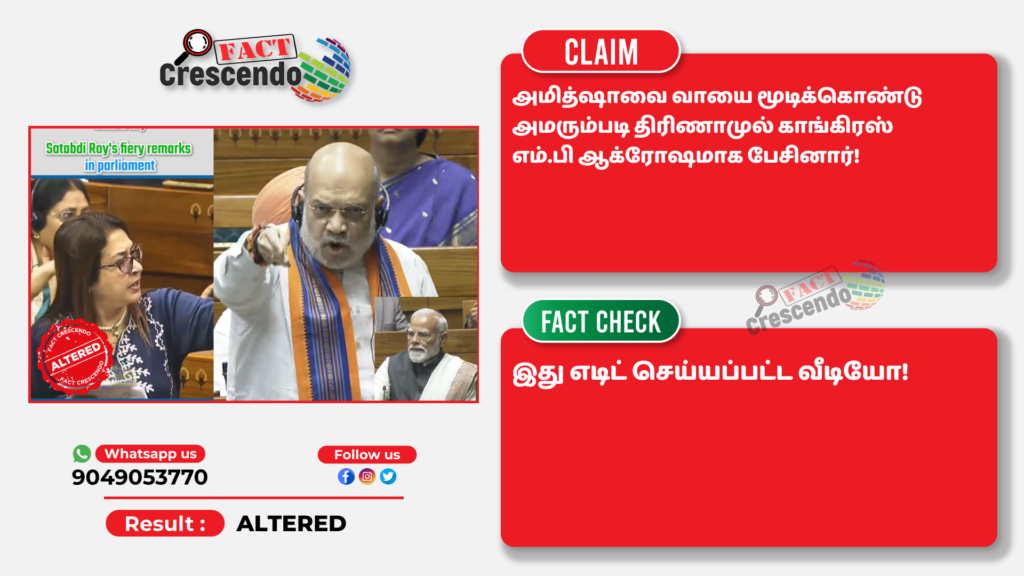 அமித்ஷாவை வாயை மூடிக்கொண்டு அமரும்படி எதிர்க்கட்சி எம்.பி ஆக்ரோஷமாக பேசியதாக பரவும் வீடியோ எடிட் செய்யப்பட்டது என்பதை தகுந்த ஆதாரங்கள் அடிப்படையில் ஃபேக்ட் கிரஸண்டோ தமிழ் உறுதி செய்துள்ளது. எனவே, இத்தகைய தவறான செய்தி, புகைப்படங்கள், வீடியோ போன்றவற்றை உறுதி செய்யாமல் மற்றவர்களுக்குப் பகிர வேண்டாம் என கேட்டுக் கொள்கிறோம். வாசகர்கள் தங்களுக்கு சந்தேகம் என்று தோன்றும் தகவல், பதிவு, புகைப்படம், வீடியோவை எங்களது வாட்ஸ் ஆப் எண்ணிற்கு (+91 9049053770) அனுப்பினால், அதுபற்றி ஆய்வு செய்து உண்மை விவரத்தை வெளியிடுகிறோம்.