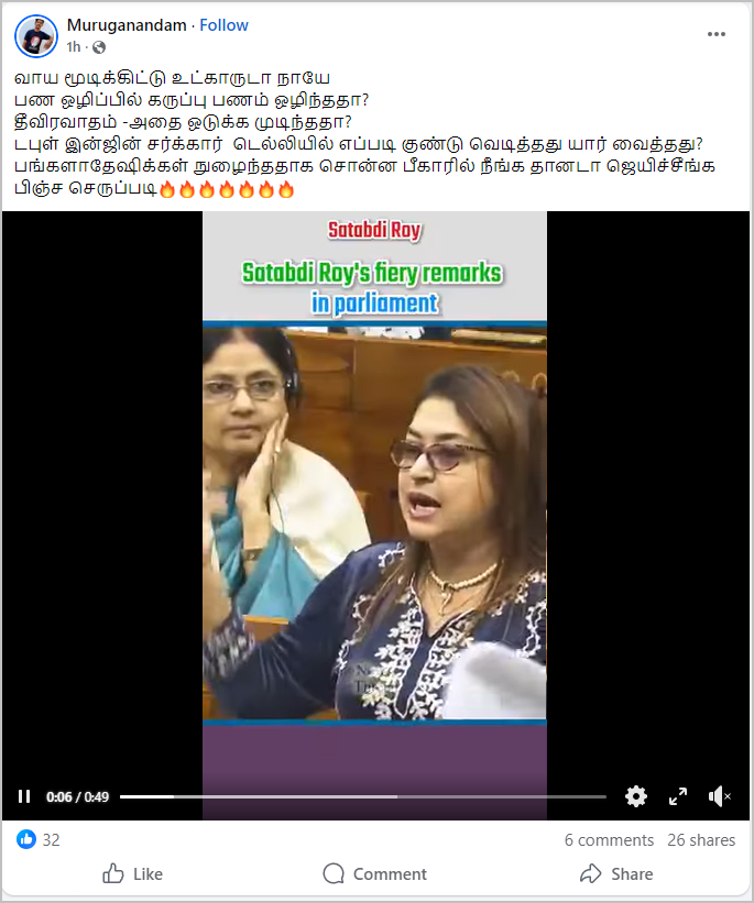 சதாப்தி ராய் என்ற திரிணாமுல் காங்கிரஸ் எம்.பி நாடாளுமன்றத்தில் பேசிய வீடியோ ஃபேஸ்புக்கில் பதிவிடப்பட்டுள்ளது. அவரது பேச்சின் போது அமித்ஷா குறுக்கிட்டது போலவும், வாயை மூடும்படி திரிணாமுல் காங்கிரஸ் எம்.பி கூறியதாகவும், இதனால் பேச முடியாமல் அமித்ஷா, பிரதமர் நரேந்திர மோடி உள்ளிட்டவர்கள் அமர்ந்திருப்பது போலவும் வீடியோ உள்ளது.