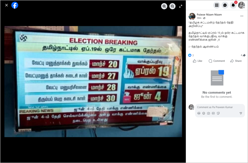 ஊடகம் ஒன்று வெளியிட்ட செய்தியை ஸ்கிரீன்ஷாட் எடுத்து ஃபேஸ்புக்கில் பதிவிட்டுள்ளனர். அதில், “தமிழ்நாட்டில் ஏப்.19ல் ஒரே கட்டமாக தேர்தல். ஜூன் 4-ம் தேதி செவ்வாய்க்கிழமை அன்று வாக்கு எண்ணிக்கை நடைபெற உள்ளது” என்று குறிப்பிடப்பட்டிருந்தது.