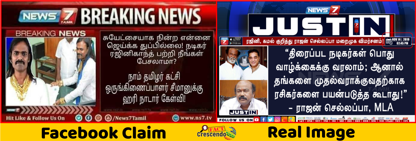நியூஸ் 7 தமிழ் பழைய நியூஸ் கார்டு ஒன்று பகிரப்பட்டுள்ளது. அதில், “சுயேட்சையாக நின்ற என்னை ஜெயிக்க துப்பில்லை, நடிகர் ரஜினிகாந்த் பற்றி நீங்கள் பேசலாமா? நாம் தமிழர் கட்சி ஒருங்கிணைப்பாளர் சீமானுக்கு ஹரி நாடார் கேள்வி” என்று குறிப்பிட்டுள்ளனர்.