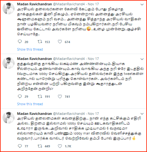 இந்நிலையில்தான், மேற்கண்ட ஃபேஸ்புக் பதிவு வெளியாகியுள்ளது. அதில், வின் டிவியின் அரசியல் பிரிவு ஆசிரியர் மதன் ரவிச்சந்திரன் எனக் கூறாமல், பாஜக பிரிவு ஆசிரியர் எனக் குறிப்பிட்டுள்ளனர்.