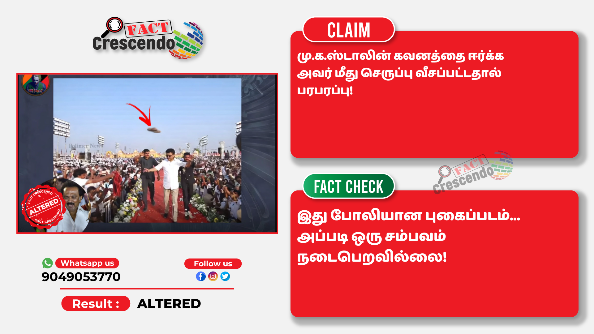 முதலமைச்சர் மு.க.ஸ்டாலினை நோக்கி செருப்பு வீசப்பட்டது போல் பரவும் புகைப்படம் போலியானது என்பதை தகுந்த ஆதாரங்கள் அடிப்படையில் ஃபேக்ட் கிரஸண்டோ தமிழ் உறுதி செய்துள்ளது. எனவே, இத்தகைய தவறான செய்தி, புகைப்படங்கள், வீடியோ போன்றவற்றை உறுதி செய்யாமல் மற்றவர்களுக்குப் பகிர வேண்டாம் என கேட்டுக் கொள்கிறோம். வாசகர்கள் தங்களுக்கு சந்தேகம் என்று தோன்றும் தகவல், பதிவு, புகைப்படம், வீடியோவை எங்களது வாட்ஸ் ஆப் எண்ணிற்கு (+91 9049053770) அனுப்பினால், அதுபற்றி ஆய்வு செய்து உண்மை விவரத்தை வெளியிடுகிறோம்.