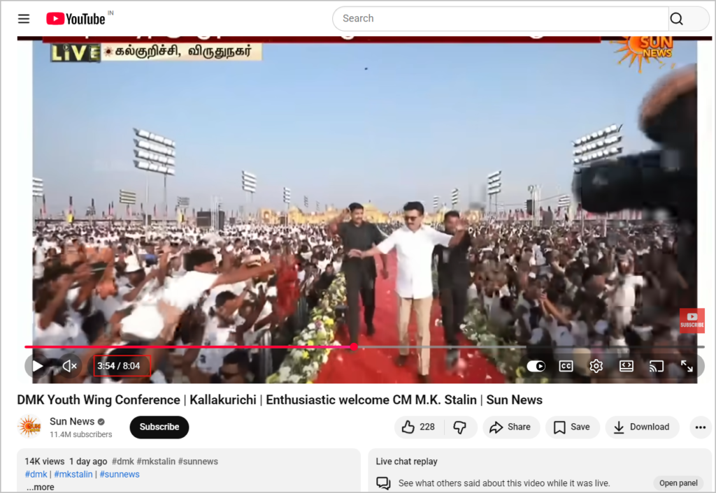 தி.மு.க இளைஞரணி மாநாட்டுக் காட்சிகளை ஊடகங்கள் நேரடி ஒளிபரப்பு செய்தன. நாம் ஆய்வுக்கு எடுத்துக்கொண்ட பதிவில் சன் நியூஸ் லோகோ இருந்ததால் அந்த ஊடகத்தில் வெளியான வீடியோவை தேடி எடுத்தோம். வீடியோவின் 3.50வது நிமிடத்தில் நாம் ஆய்வுக்கு எடுத்துக்கொண்ட பதிவில் உள்ள காட்சி வருகிறது. மு.க.ஸ்டாலினுக்கு வலது பக்கத்தில் தொண்டர் ஒருவர் கொடி அல்லது சால்வை போன்று ஒன்றைக் கொடுப்பதைக் காண முடிகிறது. அந்த நேரத்தில் அதற்கு முன்பாகவோ, அதற்கு பின்பாகவோ செருப்பு எதுவும் அந்த வீடியோவில் வீசப்படவில்லை.
