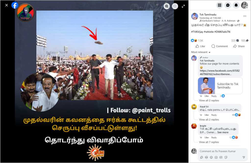 தமிழ்நாடு முதலமைச்சர் மு.க.ஸ்டாலின் நடந்து வரும்போது அவரை நோக்கி செருப்பு வீசப்பட்டது போன்று புகைப்படம் ஃபேஸ்புக்கில் பதிவிடப்பட்டுள்ளது. அந்த புகைப்படத்தில், “முதல்வரின் கவனத்தை ஈர்க்க கூட்டத்தில் செருப்பு வீசப்பட்டுள்ளது! தொடர்ந்து விவாதிப்போம்” என்று எழுதப்பட்டிருந்தது. நிலைத் தகவலில், “முதல்வர் மீது செருப்பு வீசியது யார் ?” என்று குறிப்பிடப்பட்டிருந்தது. இந்த புகைப்படத்தை பலரும் சமூக ஊடகங்களில் பகிர்ந்து வருகின்றனர்.