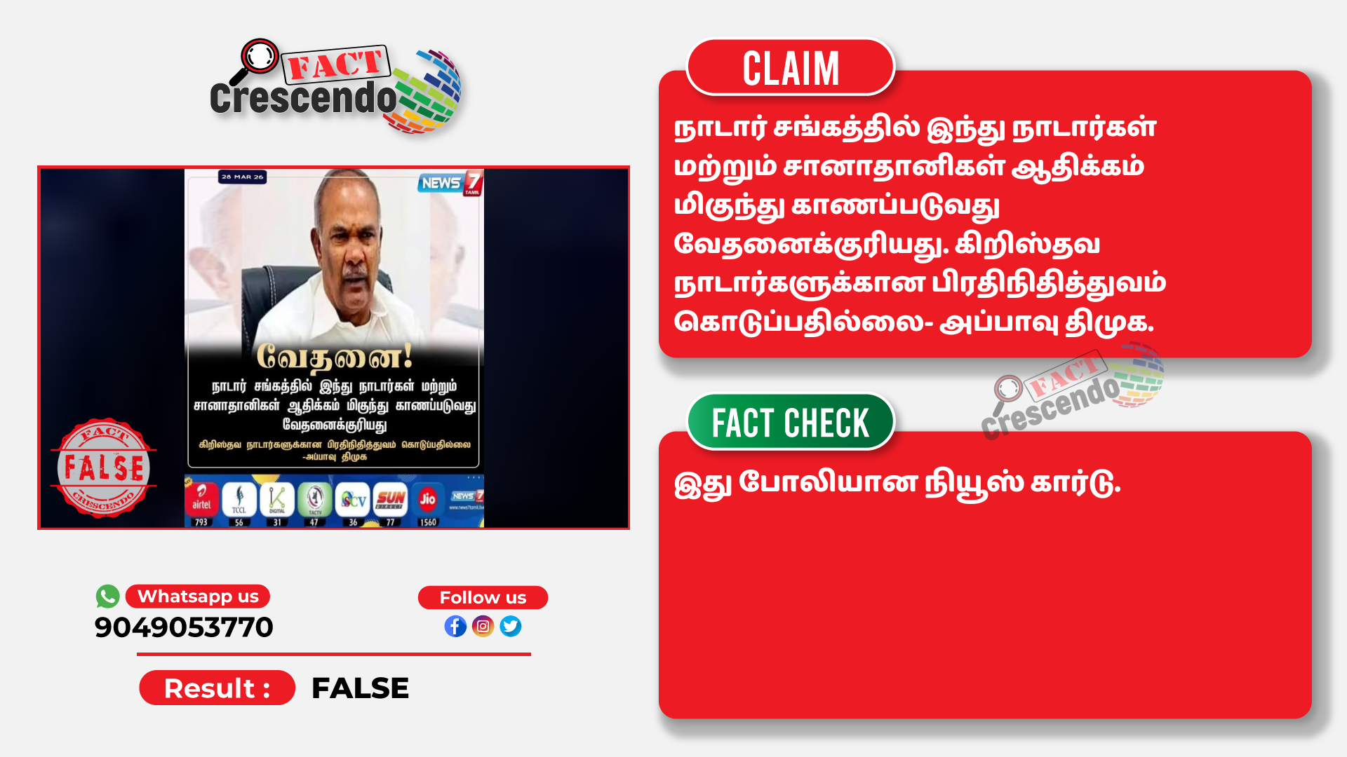 எனவே, நாம் ஆய்வுக்கு எடுத்துக் கொண்ட நியூஸ் கார்டு, உண்மையானதல்ல, என்று சந்தேகமின்றி உறுதி செய்யப்படுகிறது.