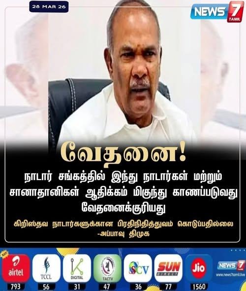 இதில், ‘’ வேதனை! நாடார் சங்கத்தில் இந்து நாடார்கள் மற்றும் சானாதானிகள் ஆதிக்கம் மிகுந்து காணப்படுவது வேதனைக்குரியது. கிறிஸ்தவ நாடார்களுக்கான பிரதிநிதித்துவம் கொடுப்பதில்லை- அப்பாவு திமுக,’’ என்று எழுதப்பட்டுள்ளது.