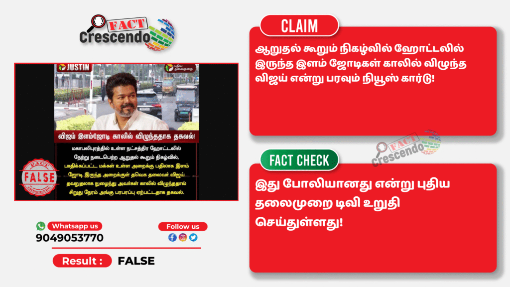 மாமல்லபுரத்தில் நடந்த ஆறுதல் கூட்டத்தில் தவறுதலாக இளஞ்ஜோடி தங்கியிருந்த அறைக்குள் நடிகர் விஜய் நுழைந்து அவர்கள் காலில் விழுந்தார் என்று பரவும் நியூஸ் கார்டு போலியானது என்பதை தகுந்த ஆதாரங்கள் அடிப்படையில் ஃபேக்ட் கிரஸண்டோ தமிழ் உறுதி செய்துள்ளது. எனவே, நமது வாசகர்கள், இத்தகைய தவறான செய்தி, புகைப்படங்கள், வீடியோ போன்றவற்றை உறுதி செய்யாமல் மற்றவர்களுக்குப் பகிர வேண்டாம் என கேட்டுக் கொள்கிறோம். வாசகர்கள் தங்களுக்கு சந்தேகம் என்று தோன்றும் தகவல், பதிவு, புகைப்படம், வீடியோவை எங்களது வாட்ஸ் ஆப் எண்ணிற்கு (+91 9049053770) அனுப்பினால், அதுபற்றி ஆய்வு செய்து உண்மை விவரத்தை வெளியிடுகிறோம்.