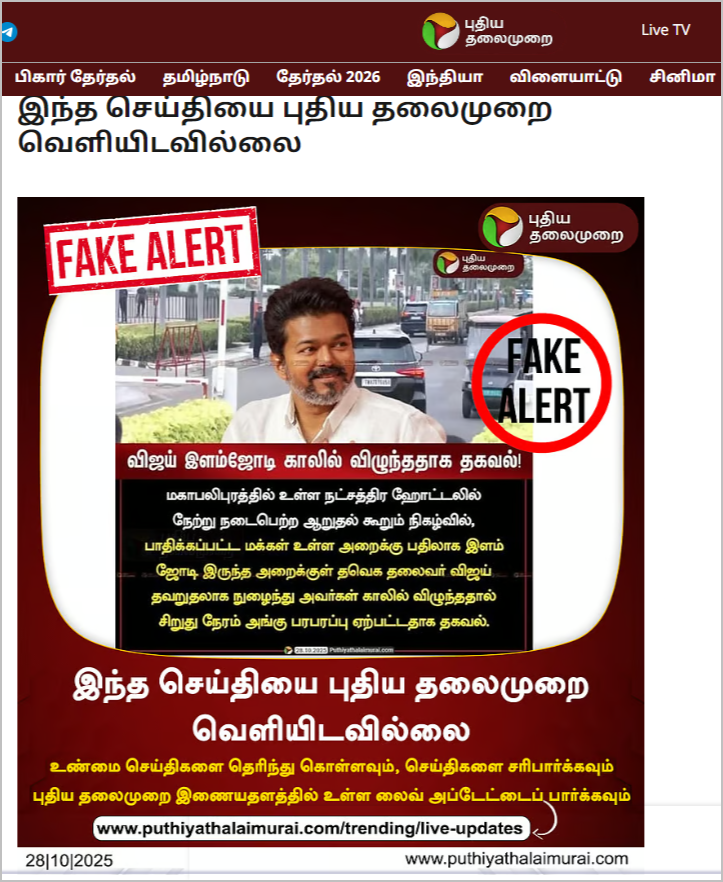 கரூர் தவெக பிரசார நிகழ்ச்சியின் போது ஏற்பட்ட கூட்ட நெரிசலில் சிக்கி உயிரிழந்தவர்களின் குடும்பத்தினருக்கு விஜய் ஆறுதல் கூறும் நிகழ்ச்சி மாமல்லபுரத்தில் உள்ள ஒரு நட்சத்திர விடுதியில் வைத்து நடத்தப்பட்டது. இந்த நிகழ்ச்சியில் பத்திரிகையாளர்கள் அனுமதிக்கப்படவில்லை. இந்த நிலையில், ஹோட்டலில் தங்கியிருந்த இளம் ஜோடி ஒன்றின் அறைக்குள் தவறுதலாக நுழைந்து அவர்கள் காலில் விழுந்த விஜய் என்று பலரும் சமூக ஊடகங்களில் நியூஸ் கார்டு ஒன்றைப் பகிர்ந்து வருகின்றனர்.