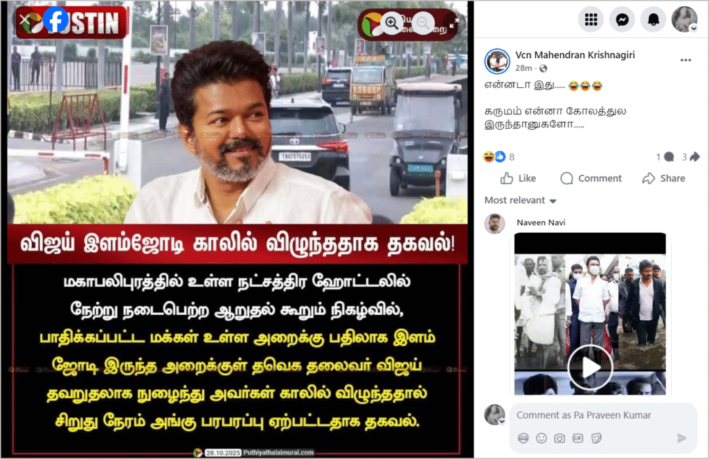 தவெக தலைவரும் நடிகருமான விஜய் புகைப்படத்துடன் புதிய தலைமுறை வெளியிட்டது போன்று நியூஸ் கார்டு ஃபேஸ்புக்கில் பதிவிடப்பட்டுள்ளது. அதில், “விஜய் இளம்ஜோடி காலில் விழுந்ததாக தகவல்! மகாபலிபுரத்தில் உள்ள நட்சத்திர ஹோட்டலில் நேற்று நடைபெற்ற ஆறுதல் கூறும் நிகழ்வில், பாதிக்கப்பட்ட மக்கள் உள்ள அறைக்கு பதிலாக இளம் ஜோடி இருந்த அறைக்குள் தவெக தலைவர் விஜய் தவறுதலாக நுழைந்து அவர்கள் காலில் விழுந்ததால் சிறுது நேரம் அங்கு பரபரப்பு ஏற்பட்டதாக தகவல்” என்று குறிப்பிடப்பட்டிருந்தது. இந்த நியூஸ் கார்டை பலரும் சமூக ஊடகங்களில் பதிவிட்டு வருகின்றனர்.