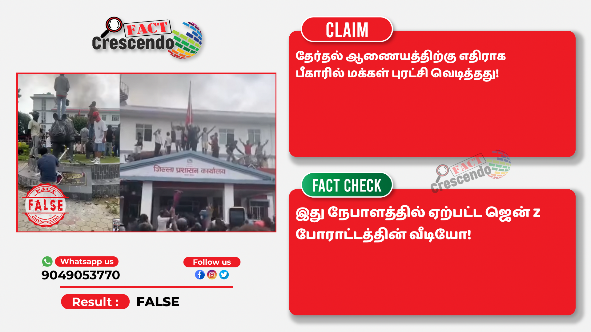 நேபாள புரட்சியின் போது எடுக்கப்பட்ட வீடியோவை தேர்தல் ஆணையத்திற்கு எதிராக பீகார் மக்கள் புரட்சி என்று தவறாக பதிவிட்டிருப்பதை தகுந்த ஆதாரங்கள் அடிப்படையில் ஃபேக்ட் கிரஸண்டோ தமிழ் உறுதி செய்துள்ளது. எனவே, நமது வாசகர்கள், இத்தகைய தவறான செய்தி, புகைப்படங்கள், வீடியோ போன்றவற்றை உறுதி செய்யாமல் மற்றவர்களுக்குப் பகிர வேண்டாம் என கேட்டுக் கொள்கிறோம். வாசகர்கள் தங்களுக்கு சந்தேகம் என்று தோன்றும் தகவல், பதிவு, புகைப்படம், வீடியோவை எங்களது வாட்ஸ் ஆப் எண்ணிற்கு (+91 9049053770) அனுப்பினால், அதுபற்றி ஆய்வு செய்து உண்மை விவரத்தை வெளியிடுகிறோம்.