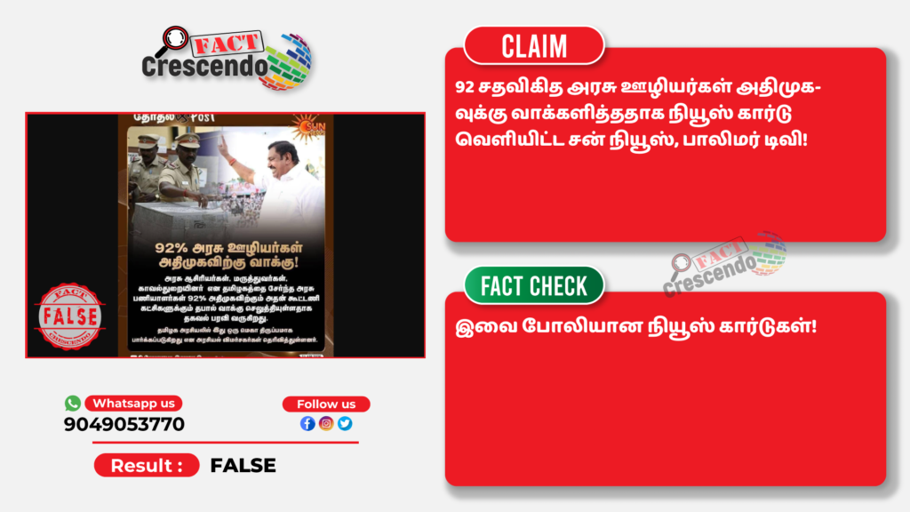 92 சதவிகித அரசு ஊழியர்கள் அதிமுக-வுக்கு வாக்களித்ததாக சன் நியூஸ் மற்றும் பாலிமர் டிவி வெளியிட்டது போன்று நியூஸ் கார்டுகள் சமூக ஊடகங்களில் வைரலாக பகிரப்பட்டு வருகின்றன. இது தொடர்பாக ஆய்வு செய்தோம்.