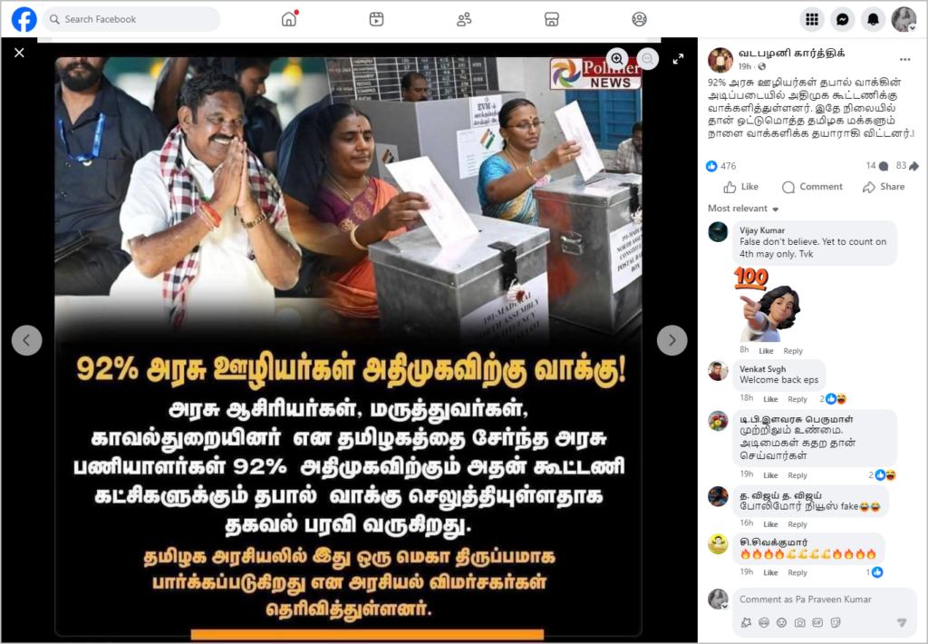 தேர்தல் பணியில் ஈடுபடும் அரசு ஊழியர்கள், முதியவர்களுக்கு தபால் வாக்கு செலுத்தும் வசதி உள்ளது. இது வாக்கு எண்ணிக்கை அன்று தான் எண்ணப்படும். ஆனால், அரசு ஊழியர்களில் 92 சதவிகிதம் பேர் அதிமுக-வுக்கு தபால் வாக்கு அளித்துள்ளதாக தகவல் பரவியுள்ளது என்று பலரும் சமூக ஊடகங்களில் பதிவிட்டு வருகின்றனர். யார் இந்த தகவலை சொன்னது என்று இல்லை.