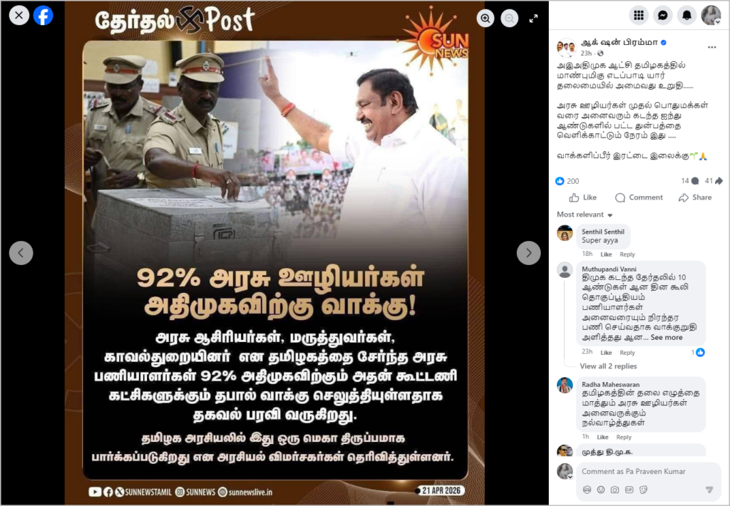 சன் நியூஸ் வெளியிட்டது போன்று நியூஸ் கார்டு ஃபேஸ்புக்கில் பதிவிடப்பட்டுள்ளது. அதில், “92% அரசு ஊழியர்கள் அதிமுகவிற்கு வாக்கு! அரசு ஆசிரியர்கள், மருத்துவர்கள், காவல்துறையினர் என தமிழகத்தைச் சேர்ந்த அரசு பணியாளர்கள் 92% அதிமுகவிற்கும் அதன் கூட்டணி கட்சிகளுக்கும் தபால் வாக்கு செலுத்தியுள்ளதாக தகவல் பரவி வருகிறது. தமிழக அரசியலில் இது ஒரு மெகா திருப்பமாக பார்க்கப்படுகிறது என அரசியல் விமர்சகர்கள் தெரிவித்துள்ளனர்” என்று குறிப்பிடப்பட்டிருந்தது.