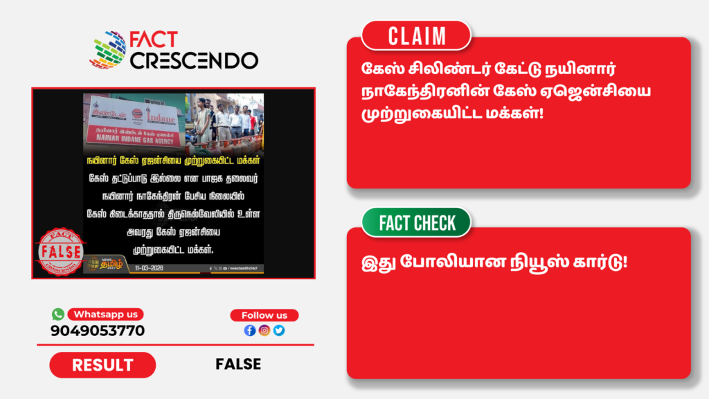 கேஸ் சிலிண்டர் கேட்டு நயினார் நாகேந்திரனின் கேஸ் ஏஜென்சியை முற்றுகையிட்ட மக்கள் என்று பரவும் நியூஸ் கார்டு போலியானது என்பதை தகுந்த ஆதாரங்கள் அடிப்படையில் ஃபேக்ட் கிரஸண்டோ தமிழ் உறுதி செய்துள்ளது. எனவே, இத்தகைய தவறான செய்தி, புகைப்படங்கள், வீடியோ போன்றவற்றை உறுதி செய்யாமல் மற்றவர்களுக்குப் பகிர வேண்டாம் என கேட்டுக் கொள்கிறோம். வாசகர்கள் தங்களுக்கு சந்தேகம் என்று தோன்றும் தகவல், பதிவு, புகைப்படம், வீடியோவை எங்களது வாட்ஸ் ஆப் எண்ணிற்கு (+91 9049053770) அனுப்பினால், அதுபற்றி ஆய்வு செய்து உண்மை விவரத்தை வெளியிடுகிறோம்.