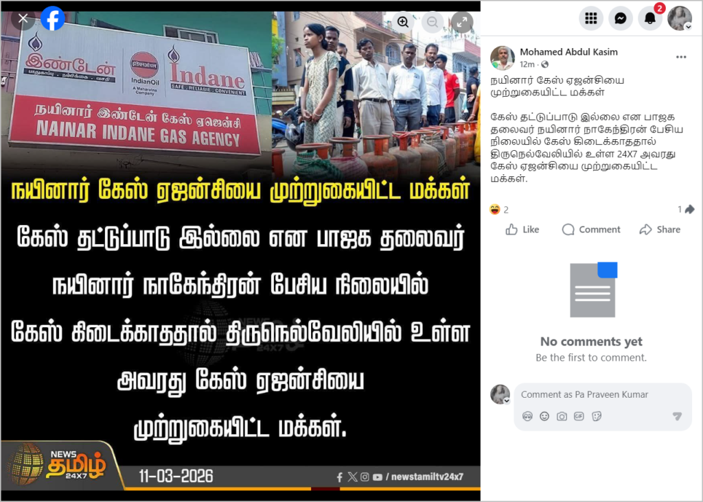 கேஸ் கிடைக்காததால், நயினார் நாகேந்திரனுக்கு சொந்தமான கேஸ் ஏஜென்சியை மக்கள் முற்றுகையிட்டதாக ஒரு நியூஸ் காரட் சமூக ஊடகங்களில் பகிரப்பட்டு வருகிறது. இது தொடர்பாக ஆய்வு செய்தோம்.