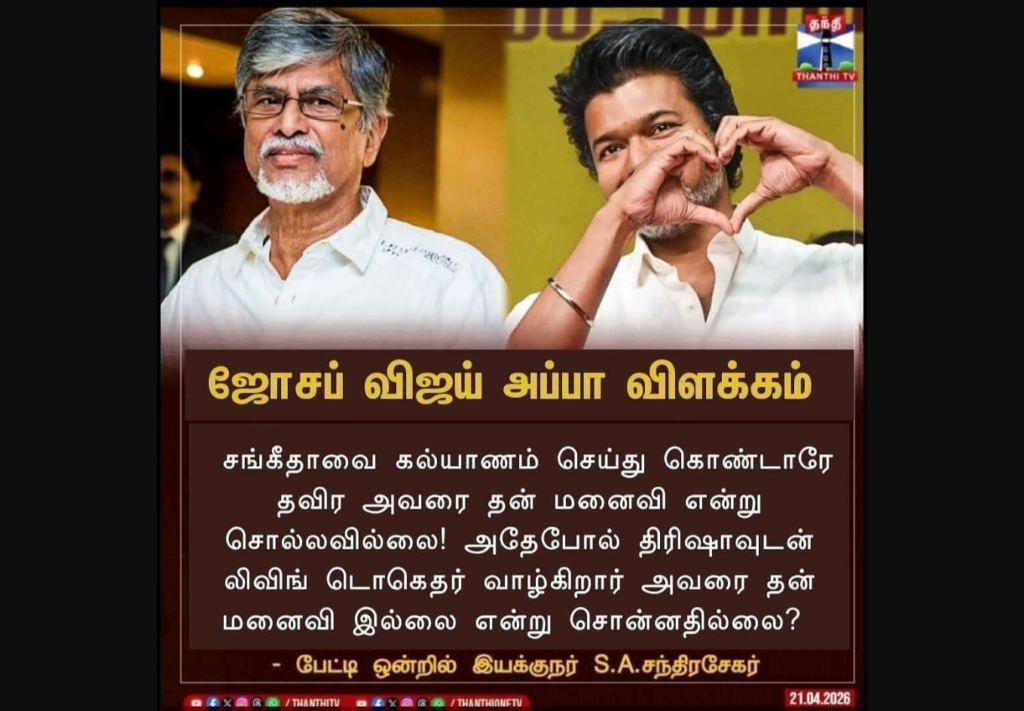 தந்தி டிவி வௌியிட்டது போன்று நியூஸ் கார்டு ஃபேஸ்புக்கில் பதிவிடப்பட்டுள்ளது. அதில், “ஜோசப் விஜய் அப்பா விளக்கம். சங்கீதாவை கல்யாணம் செய்து கொண்டாரே தவிர அவரை தன் மனைவி என்று சொல்லவில்லை! அதேபோல் திரிஷாவுடன் லிவிங் டொகெதர் வாழ்கிறார் அவரை தன் மனைவி இல்லை என்று சொன்னதில்லை? – பேட்டி ஒன்றில் இயக்குநர் எஸ்.ஏ.சந்திரசேகர்” என்று குறிப்பிடப்பட்டிருந்தது. இந்த நியூஸ் கார்டை பலரும் சமூக ஊடகங்களில் பதிவிட்டு வருகின்றனர்.