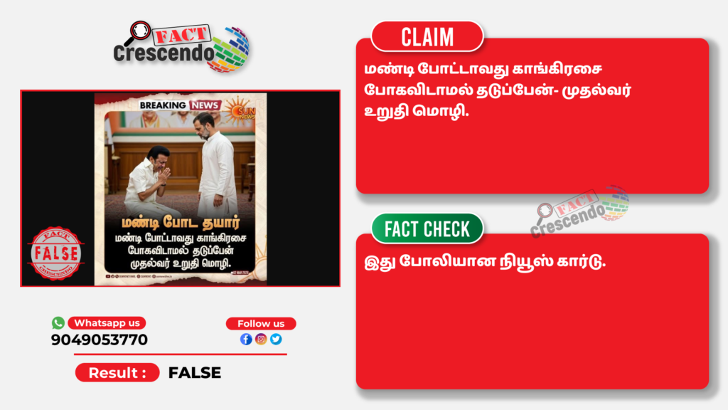 உரிய ஆதாரங்களின் அடிப்படையில் மேற்கண்ட தகவல் நம்பகமானது இல்லை என்று ஃபேக்ட் கிரஸண்டோ தமிழ் நிரூபித்துள்ளது. நமது வாசகர்கள் இத்தகைய தவறான செய்தி, புகைப்படம் மற்றும் வீடியோவை கண்டால், எங்களது வாட்ஸ் ஆப் எண்ணிற்கு (+91 9049053770) அனுப்புங்கள். நாங்கள், அதுபற்றி ஆய்வு செய்து உண்மை விவரத்தை வெளியிடுகிறோம்.