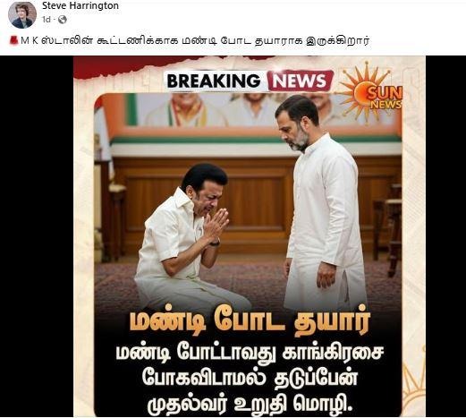‘‘கூட்டணிக்காக மண்டி போட தயார்,’’ என்று மு.க.ஸ்டாலின் கூறியதாக, சமூக வலைதளங்களில் பரவும் தகவல் பற்றி ஆய்வு மேற்கொண்டோம்.