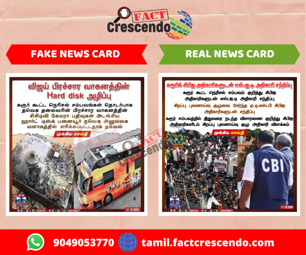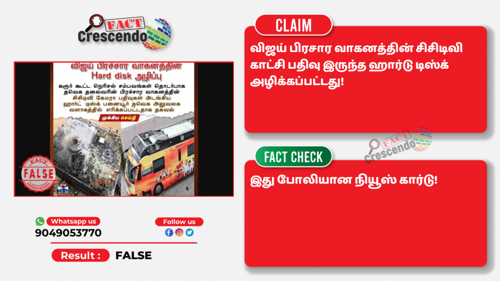 விஜய் பிரசார வாகனத்தின் சிசிடிவி காட்சி பதிவு இருந்த ஹார்டு டிஸ்க் அழிக்கப்பட்டதாக பரவும் நியூஸ் கார்டு போலியானது என்பதை தகுந்த ஆதாரங்கள் அடிப்படையில் ஃபேக்ட் கிரஸண்டோ தமிழ் உறுதி செய்துள்ளது. எனவே, நமது வாசகர்கள், இத்தகைய தவறான செய்தி, புகைப்படங்கள், வீடியோ போன்றவற்றை உறுதி செய்யாமல் மற்றவர்களுக்குப் பகிர வேண்டாம் என கேட்டுக் கொள்கிறோம். வாசகர்கள் தங்களுக்கு சந்தேகம் என்று தோன்றும் தகவல், பதிவு, புகைப்படம், வீடியோவை எங்களது வாட்ஸ் ஆப் எண்ணிற்கு (+91 9049053770) அனுப்பினால், அதுபற்றி ஆய்வு செய்து உண்மை விவரத்தை வெளியிடுகிறோம்.