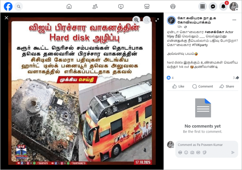 தந்தி டிவி வெளியிட்டது போன்று நியூஸ் கார்டு ஃபேஸ்புக்கில் பதிவிடப்பட்டுள்ளது. அதில், “விஜய் பிரச்சார வாகனத்தின் Hard disk அழிப்பு. கரூர் கூட்ட நெரிசல் சம்பவங்கள் தொடர்பாக தவெக தலைவரின் பிரச்சார வாகனத்தின் சிசிடிவி கேமரா பதிவுகள் அடங்கிய ஹார்ட் டிஸ்க் பனையூர் தவெக அலுவலக வளாகத்தில் எரிக்கப்பட்டதாக தகவல்” என்று குறிப்பிடப்பட்டிருந்தது. இந்த நியூஸ் கார்டை பலரும் சமூக ஊடகங்களில் பதிவிட்டு வருகின்றனர்.