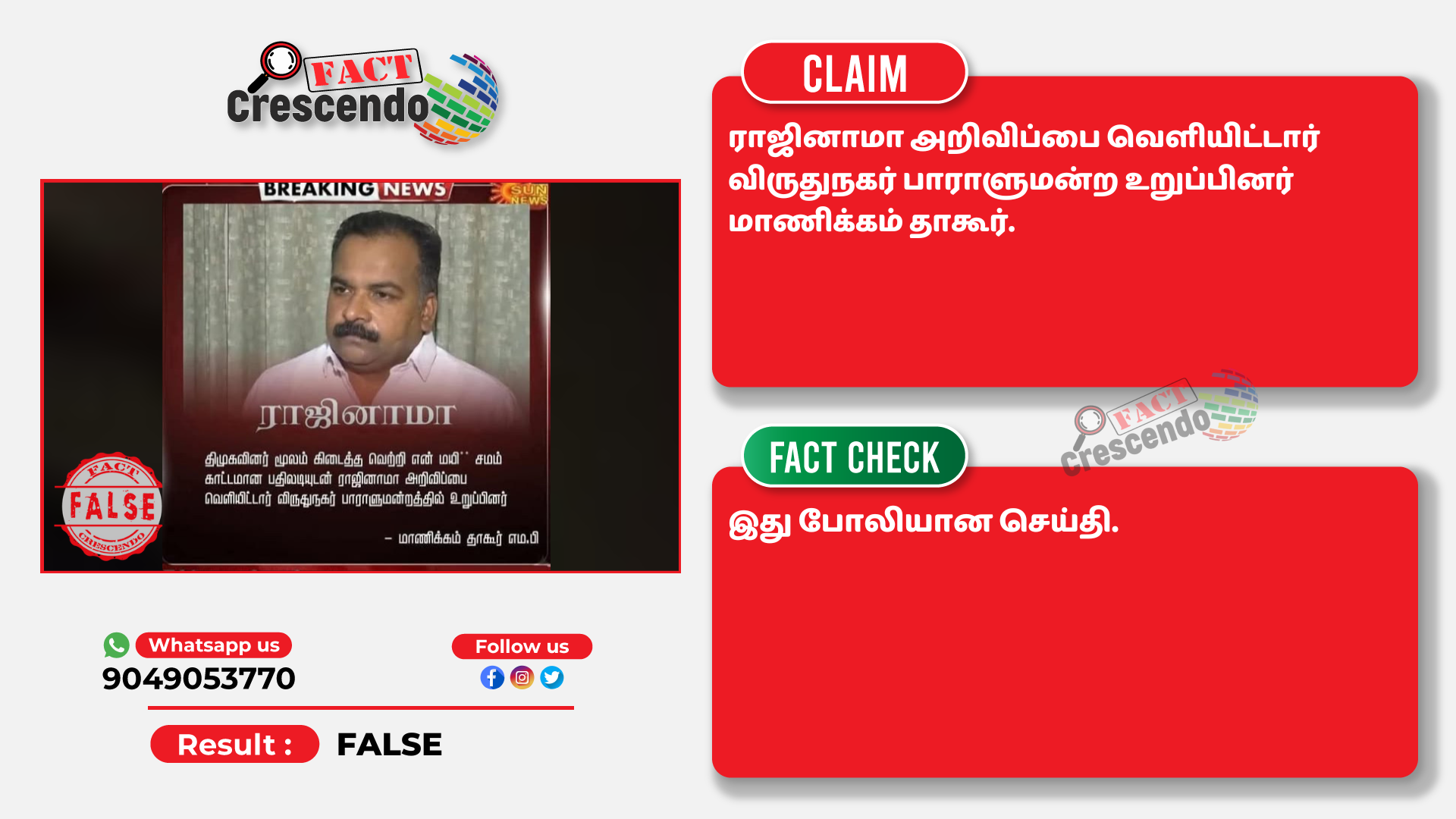 இதேபோன்று, பாலிமர் லோகோவுடன் ஒரு நியூஸ் கார்டு பரவுகிறது. அதில்,’’ விருதுநகர் எம்.பி.யும் காங்கிரஸ் முக்கிய நிர்வாகியுமான மாணிக்கம் தாகூர் நாளை காலை சபாநாயகர் ஒம்பிர்லாவை சந்தித்து தனது ராஜினாமா கடிதத்தை வழங்க இருப்பதாக தகவல்.! காங்கிரஸ் வட்டாரத்தில் அதிர்ச்சி,’’ என்று எழுதப்பட்டுள்ளது.